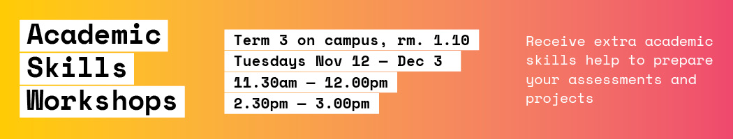 Academic Skills Workshops, T3 2019 [Weeks 9 - 12]Open to all students and teaching and non-teaching staff, brush up on your academic skills to prepare for your assessments and projects with these workshops run by our Academic Skills Facilitator, Luciana Rodriguez.